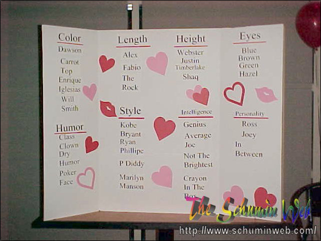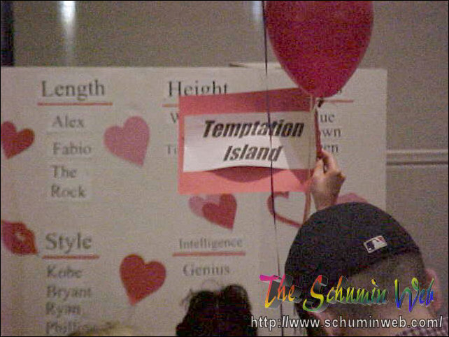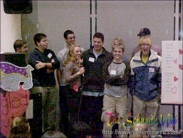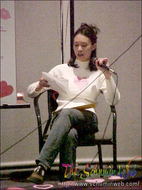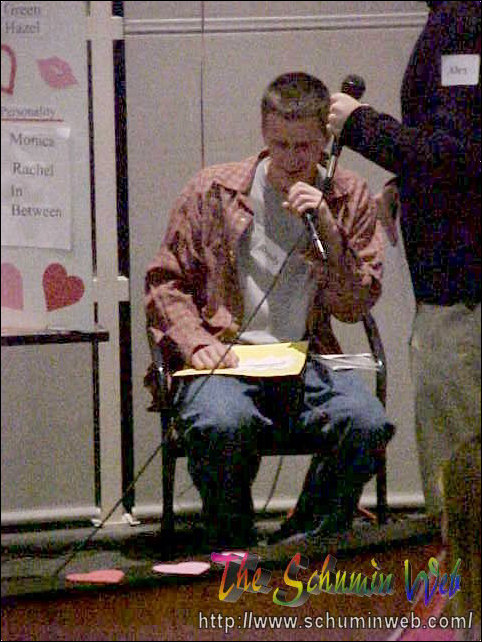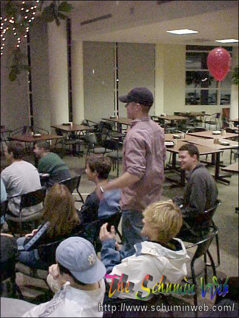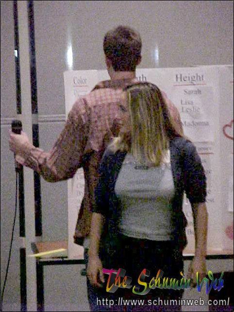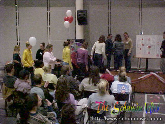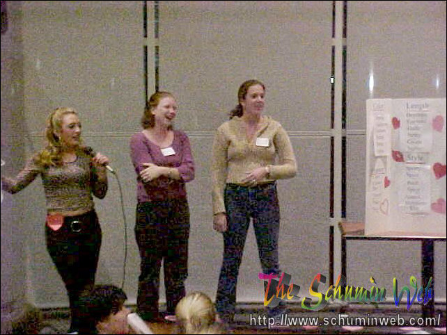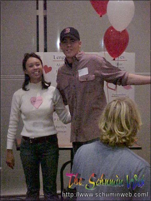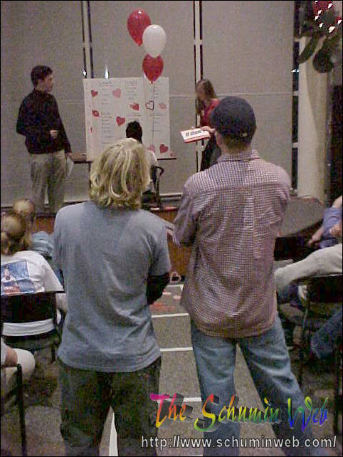 On November 12, 2001, Potomac Hall’s Community Council put on a production of the relationship game show Singled Out. They reserved the Festival, and got four people gift certificates, and “strongly encouraged” the winning pairs to redeem their gift certificates together. It was comical how far the Community Council was required to go to emphasize that they were not setting people up on dates (Residence Life insisted on it!). Christine Yip was the female who would be given a gift certificate along with one lucky male, and Brody was the male who would get a gift certificate along with one lucky female. So let’s head on over to the Festival and see what’s going on!