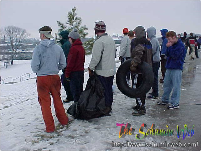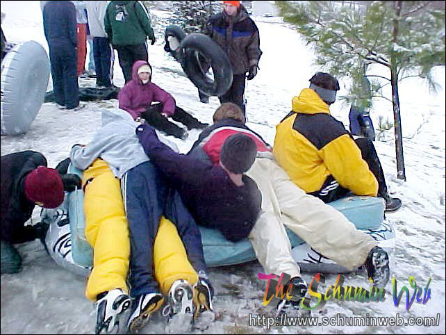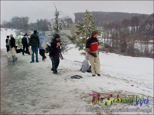 Meanwhile, everyone stands up at the top of the hill planning a strategy for their next slide, especially those going over the makeshift snow ramp.