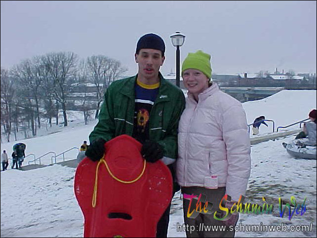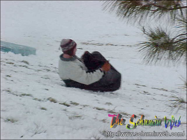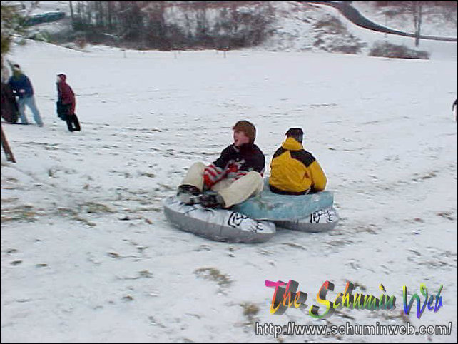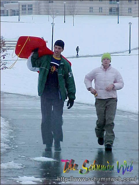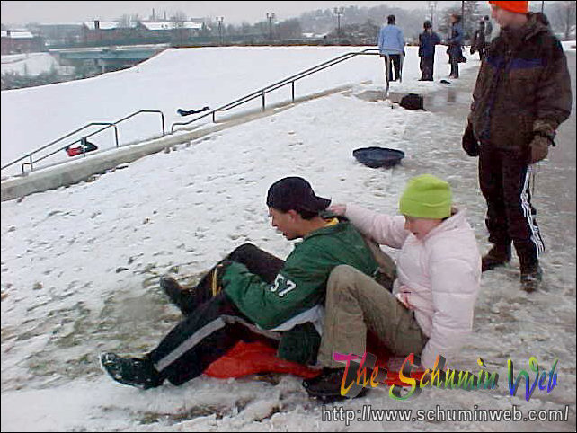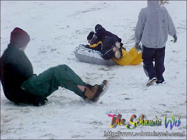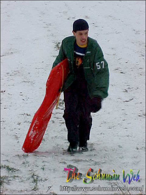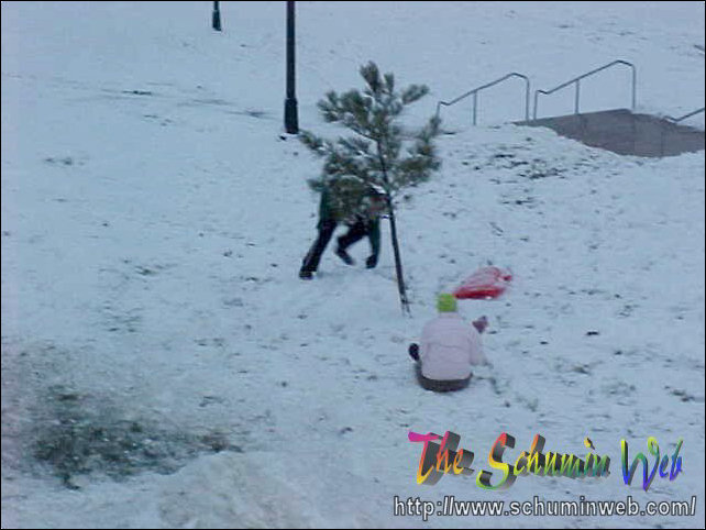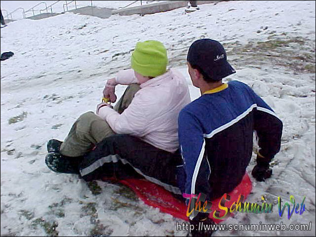 Now, here come Raleigh and Lindsay from Potomac to join in the sledding! Raleigh brought a real sled, believe it or not, which made this the most sophisticated piece of sledding equipment that there was.