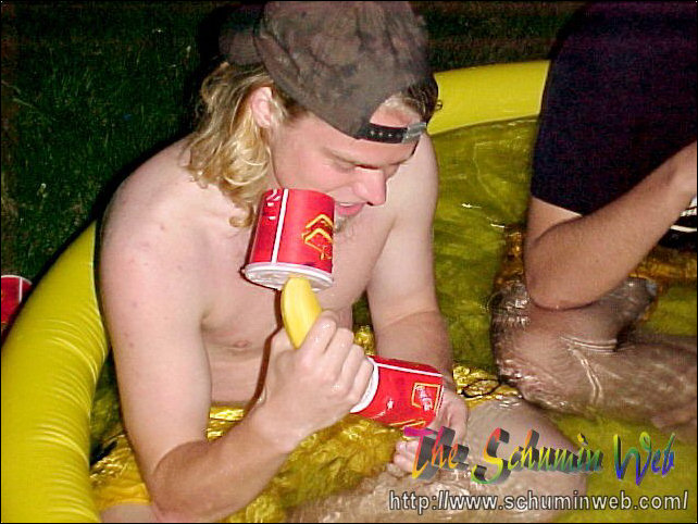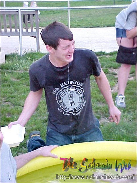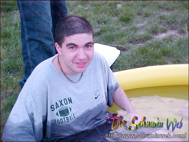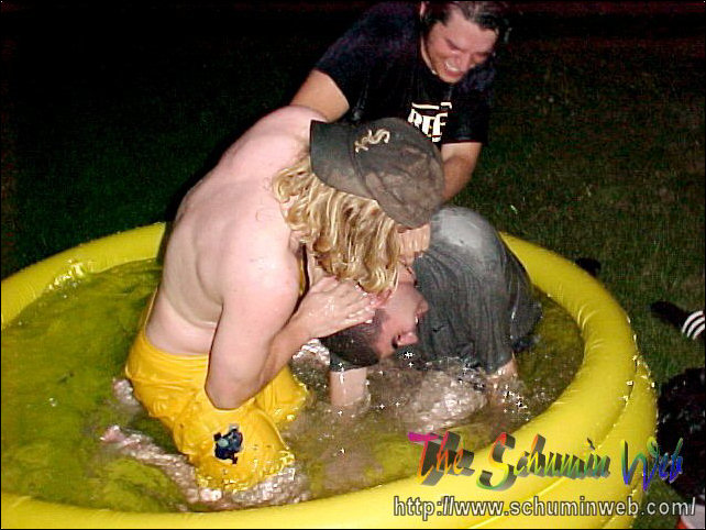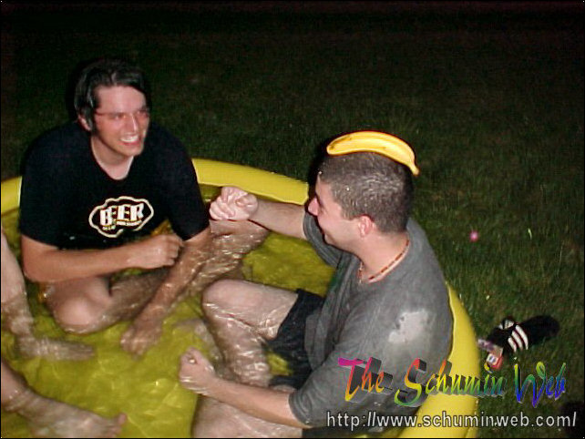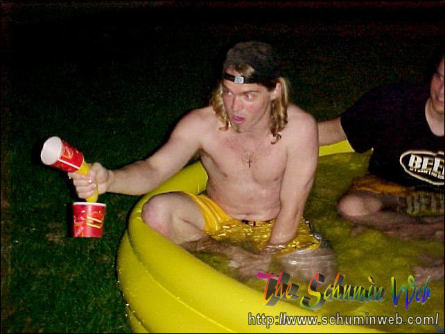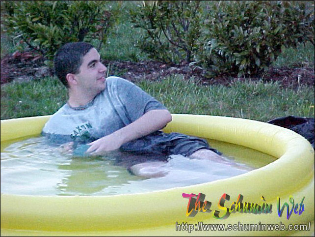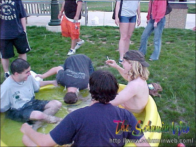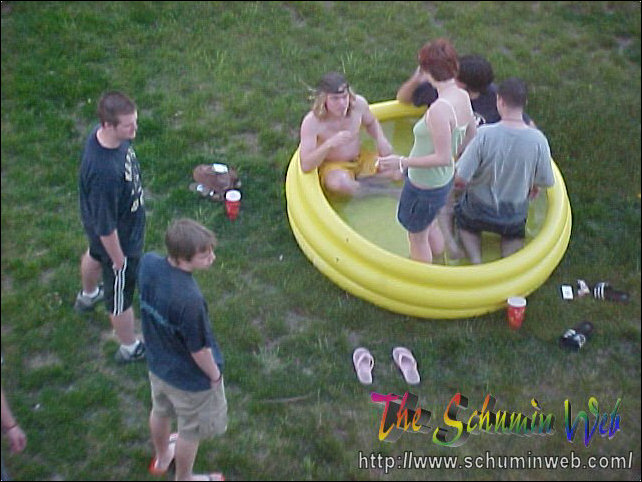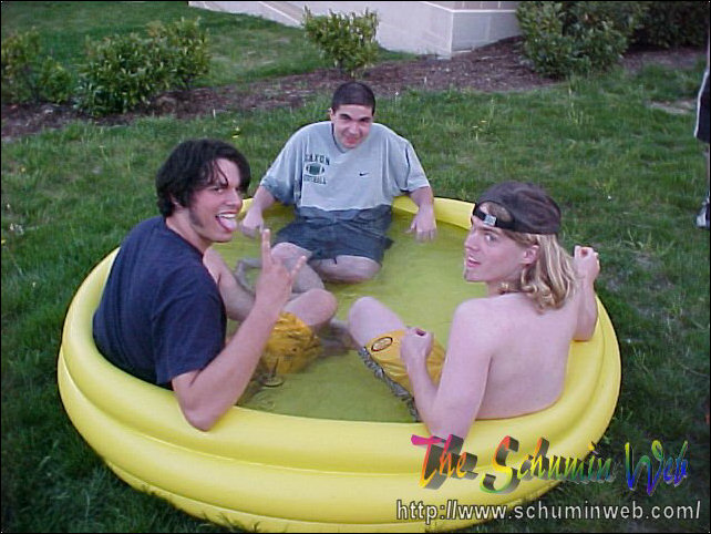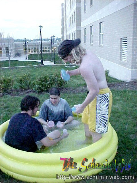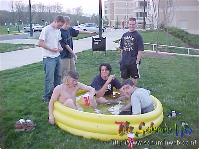 The thing I miss about my own freshman year is the way that you use resources and spend little to no money in doing it. This year, I get to live out the freshman experience once again through my residents. On this particular occasion, Kaveh, Scott, and others bought an inflatable swimming pool at Wal-Mart for $10, put it out behind the freshman side, just beyond the smoking area, and filled it up with water from the showers. After the pool got filled up, Kaveh, Scott, and Chris climbed on in! And they had fun, too! You may wonder how long the pool lasted before it got taken down. The answer was, it lasted one day. We had one evening with the pool, and then the groundskeepers the next day took the pool. Sad to see it go, but fun while it lasted.