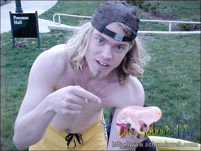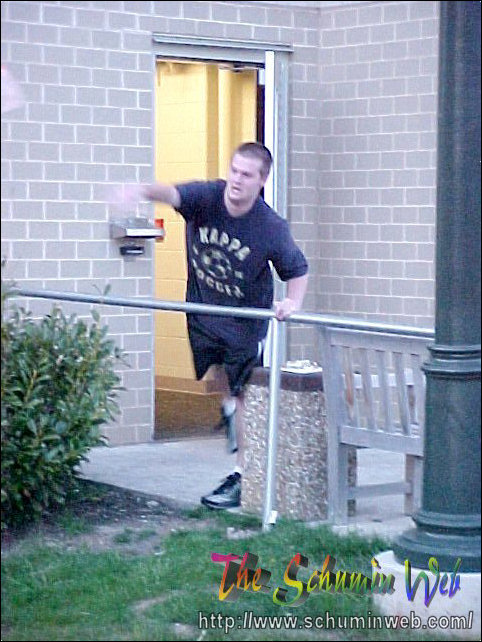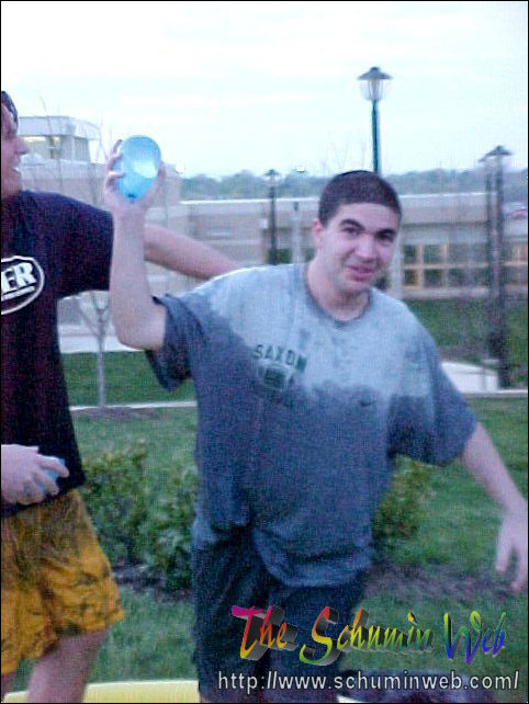 “See, Schumin, let me show you. This water balloon is going to hit Chris if he comes out again.”