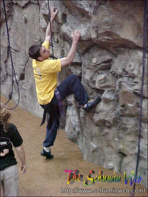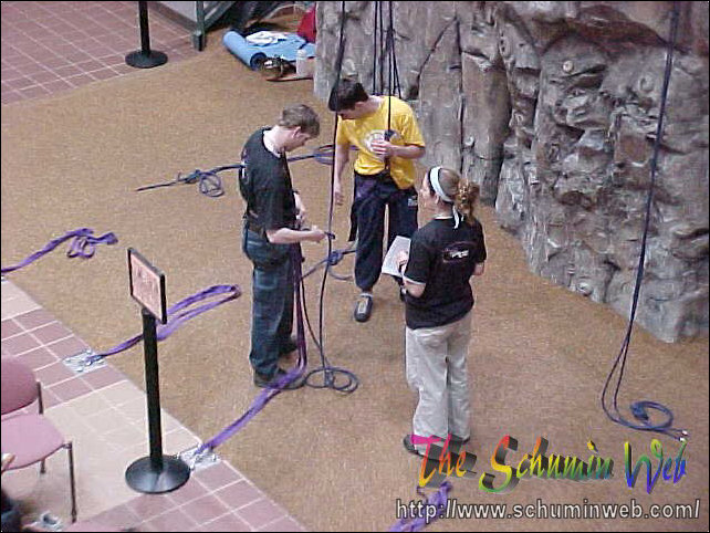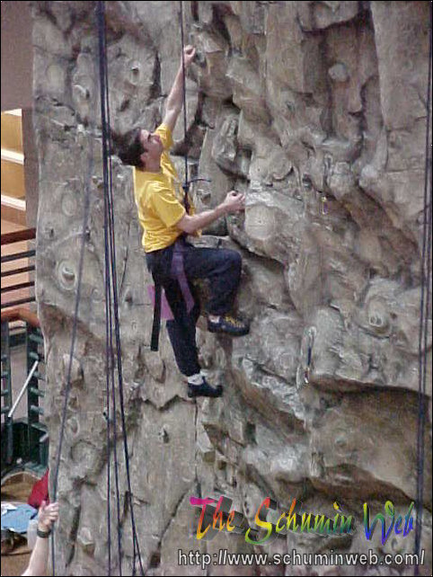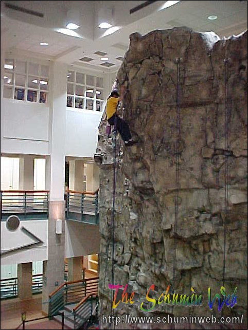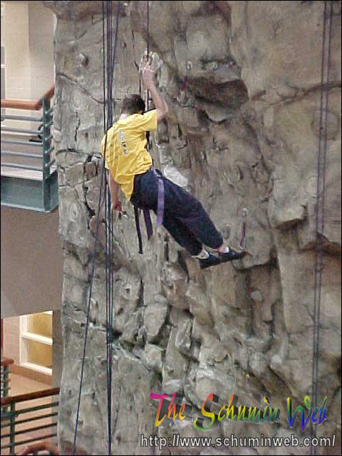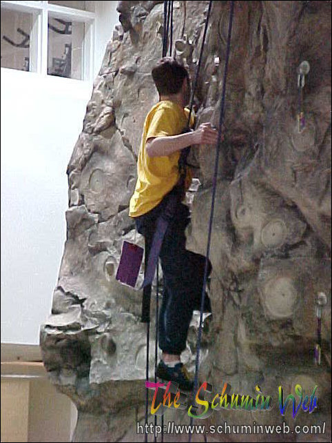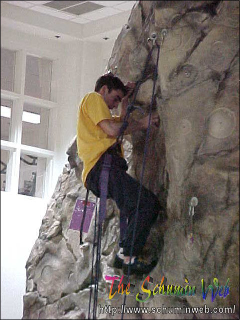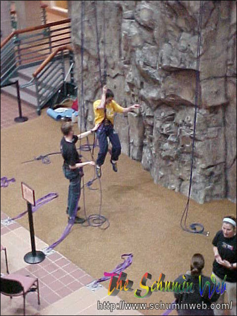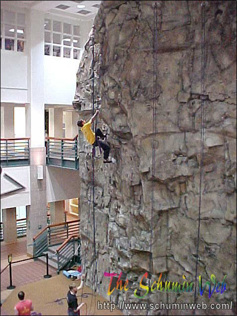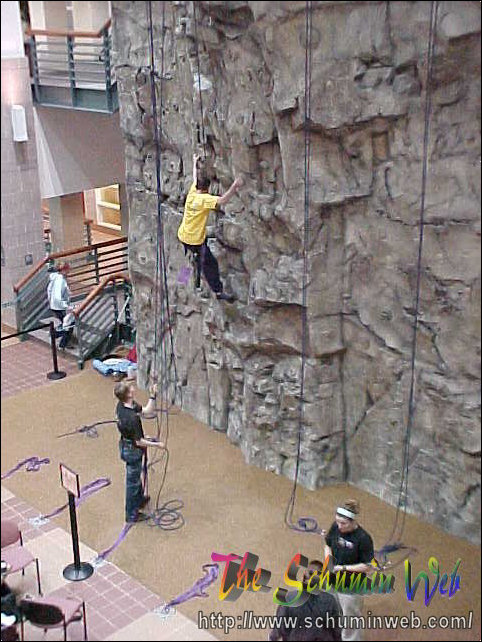 Victory! Pat reaches the top of his rope, thus completing the climb to the top. In this picture, he is at the level of the third floor.