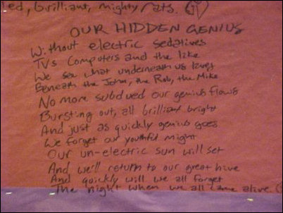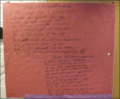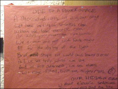 When the power went out on February 15, 2000, as I was walking around with members of the hall staff, we encountered two very impressive poems written on a bulletin board. There was paper on the bulletin board, and thus it didn’t damage the board, so it was simply something to marvel at. The author stayed anonymous, and so there was no hand to shake. This is some really good stuff. I’ve typed the poems below the pictures to make sure they’re readable.